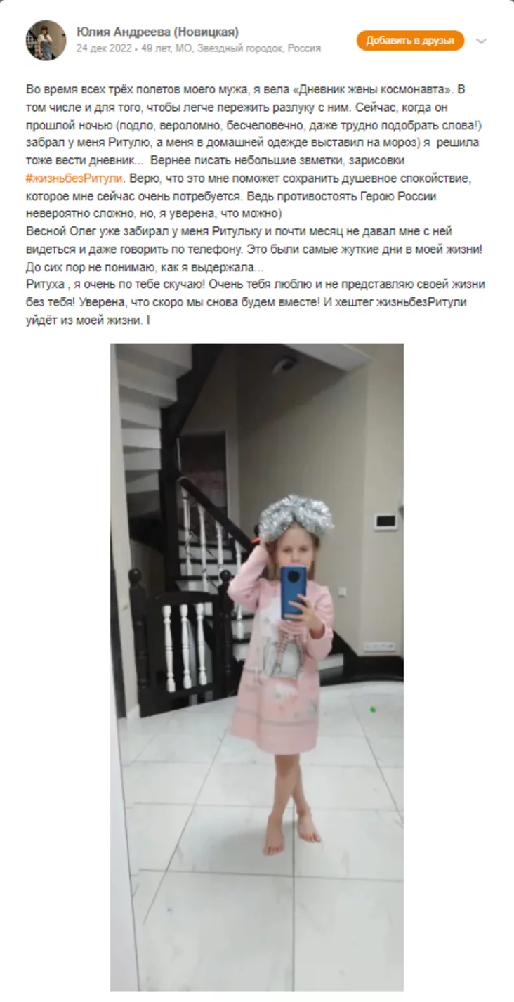 А ўжо ў снежні 2022 года жанчына выклала ў інстаграм відэа з просьбай абараніць яе ад героя (Навіцкі мае званне Героя Расіі) — тады яна прызналася, што знаходзіцца ў працэсе разводу з касманаўтам.