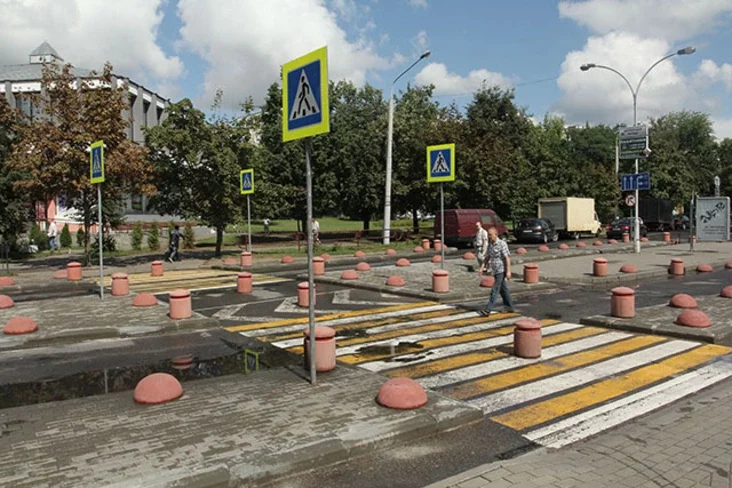 «Пераход добра праглядаецца з кіроўчага сядзення, паколькі ў непасрэднай блізкасці адсутнічаюць будынкі, зялёныя насаджэнні і, самае галоўнае, прыпаркаваны транспарт, — адзначае Т. Харлінская. — Шырыня вуліцы на пешаходным пераходзе і на пад'ездзе да яго роўная 3,5 м, што не дазваляе несвядомым кіроўцам ажыццяўляць паблізу прыпынак і стаянку транспартных сродкаў. Эфектыўнай перашкодай для парушальнікаў правілаў паркоўкі становяцца і малыя архітэктурныя формы (са святлоадбівальнымі ўстаўкамі) на тратуары».
