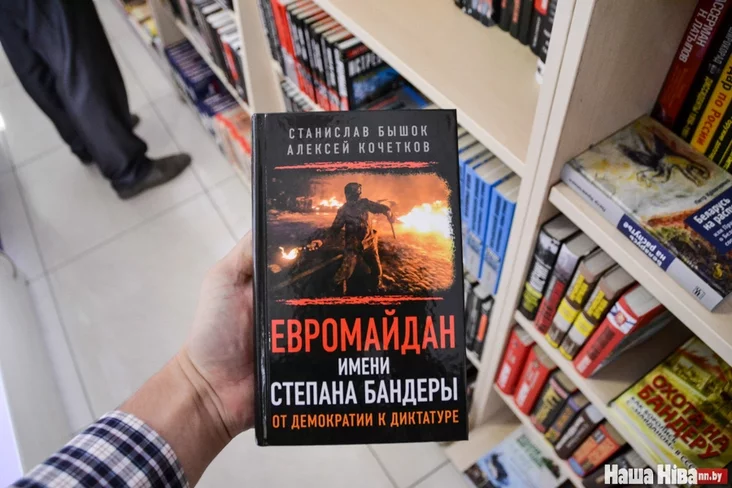 А вось у краме «Дом кнігі «Веды» насупраць будынка Адміністрацыі прэзідэнта ўдалося знайсці цэлую антыўкраінскую палічку.