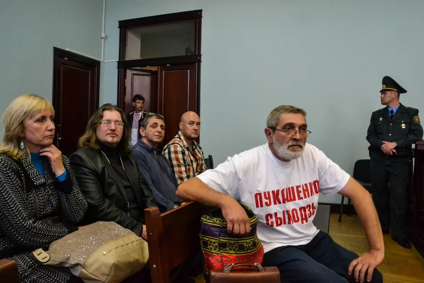 Сёння Рубцоў прыйшоў на суд у майцы «Лукашэнка, сыходзь». Працэс вяла суддзя Наталля Вайцяховіч.