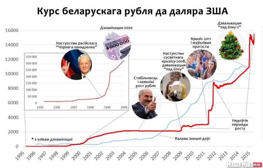 З 2000 года беларускі рубель стаў таннейшы ў амаль 50 раз, з 320 рублёў за даляр да сённяшніх 15,5 тысяч. Калі ж лічыць з 1995 года (улічваючы дэнамінацыю-2000), — у 1332 разы. А калі з яго ўвядзення ў абарот летам 1992-га — ва ўсе 119 тысяч раз.