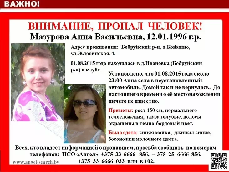 1 жніўня дзяўчына знаходзілася ў вёсцы Іванаўка (Бабруйскі раён) у клубе. Устаноўлена, што каля 23.00 яна села ў неўстаноўлены аўтамабіль. Дадому так і не вярнулася. Дагэтуль аб яе месцазнаходжанні нічога не вядома.