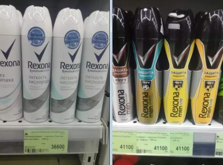Тут усё адназначна — мужчынскія каштуюць больш, і справа тут не ў маркетынгу. Дзеючыя рэчывы ў мужчынскіх і жаночых дэзадарантах аднолькавыя. Асноўны элемент большасці антыперспірантаў — алюмінію хлоргідрат, але ў мужчынскіх антыперспірантах яго канцэнтрацыя вышэйшая, чым у жаночых. Праз гэты фактар мы і бачым розніцу ў цэнах. Напрыклад, аэразоль «Rexona men» каштуе 41 100 рублёў, а падобны аэразоль «Rexona» для жанчын — 36 600 рублёў.