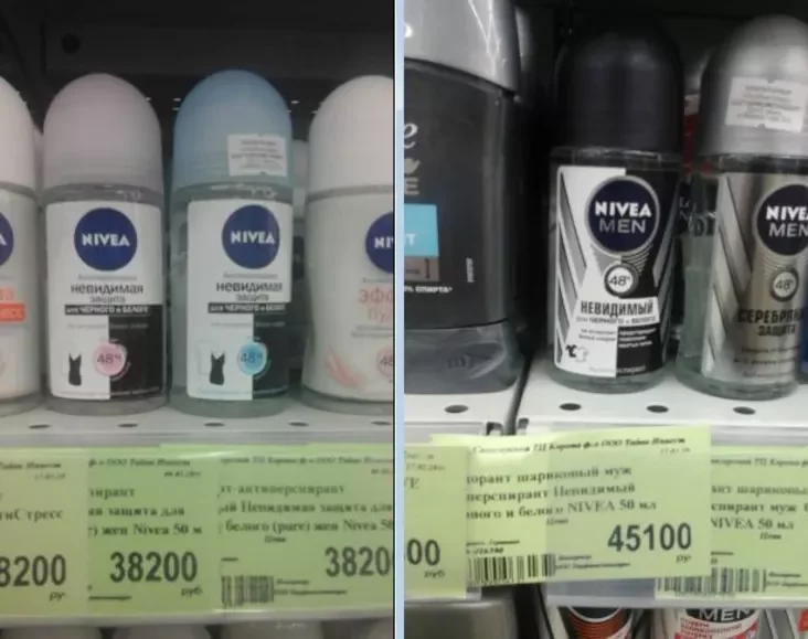 Шарыкавы мужчынскі антыперспірант «Nivea men для чорнага і белага» каштуе 45 100 рублёў, у той час, як падобны жаночы «Nivea для для чорнага і белага» таннейшы — 38 200 рублёў.