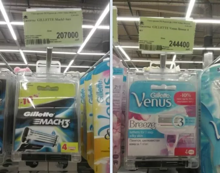 Напрыклад, 4 касеты «Gillette Mach 3» каштуюць 207 тысяч, а 4 касеты «Gillette Venus Breeze» — 244 400 рублёў. Адзіная розніца паміж гэтымі касетамі — гелевыя ўстаўкі ў «Gillette Venus Breeze», але яны з’яўляюцца хутчэй элементам дызайну, чым актыўнай часткай брытвы.