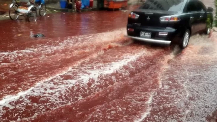 Затопленыя ў выніку моцных дажджоў вуліцы сталіцы Бангладэш Дацы афарбаваліся ў чырвоны колер пасля маштабнага забою жывёл у гонар мусульманскага свята Курбан-байрам.