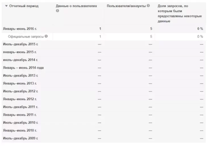 У кастрычніку кампанія Google апублікавала «справаздачу аб празрыстасці» за першае паўгоддзе 2016 года. Упершыню карпарацыя паведаміла аб запыце дадзеных карыстальнікаў, які паступіў з Беларусі.