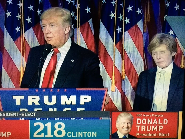 Малодшы сын Дональда Трампа, дзесяцігадовы Бэран, ледзь не заснуў, пакуль яго бацька выступаў з першай прамовай у якасці абранага прэзідэнта ЗША. Відэазапіс выступлення мільярдэра апублікаваў тэлеканал Sky News.