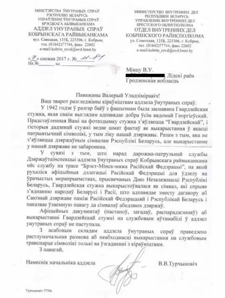 Жыхар Ліды Валер Мінец атрымаў афіцыйны адказ на свой ліст у раённую ДАІ, напісаны пасля таго, як заўважыў і сфатаграфаваў патрульны аўтамабіль з георгіеўскай стужкаю, прымацаванаю да лабавога шкла. Ліст аказаўся адпіскаю — паведаміў актывіст у сваім фэйсбук-акаўнце.