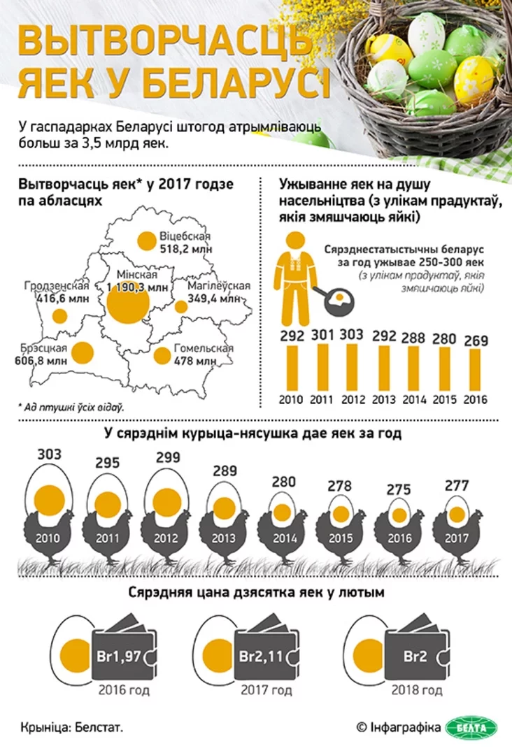 У гаспадарках Беларусі штогод атрымліваюць больш за 3,5 мільярда яек, а сярэднестатыстычны беларус за год ужывае 250-300 штук (з улікам прадуктаў, якія змяшчаюць яйкі), перадае БелТА.