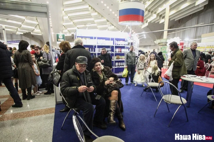 І так заўжды багатыя расійскія стэнды сёлета яшчэ больш шыкоўныя. Там жа вісіць партрэт адзінай беларускай нобелеўскай лаўрэаткі Святланы Алексіевіч. Сустрэча з ёй адбудзецца ў суботу. І праходзіць яна будзе ўсё ж у актавай зале, а не на вялікім расійскім стэндзе.