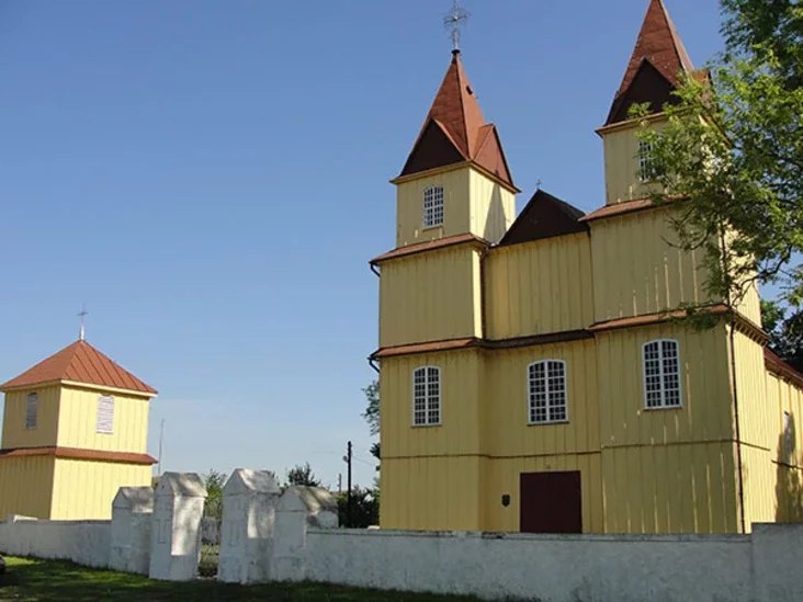 Першы пункт маршрута - касцёл Нараджэння Панны Марыі ў вёсцы Дуды. Драўляны храм захаваўся ад 1772 года, гэта яскравы помнік народнай архітэктуры.