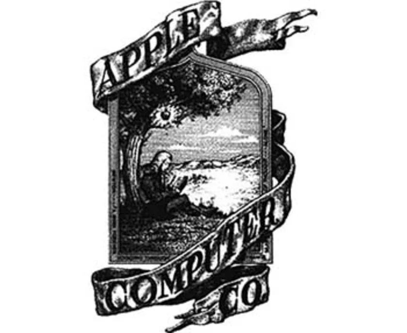 Першы лагатып «Эпл» быў зроблены ў 1976 заснавальнікамі фірмы Стывам Джобсам і Рональдам Вэйнам, суправаджаючы першы ж прадукт фірмы, камп’ютар «Эпл-1». Тое быў, мякка кажучы, змястоўны таварны знак. На ім быў выяўлены матэматык і фізік Ісаак Ньютан, які сядзеў пад яблыняй, з галіны якой звісаў абкружаны німбам яблык, што меўся ашчаслівіць начынне чарапной каробкі навукоўца. Літаральна праз год заснавальнікі памянялі той забагаты лагатып на больш простую выяву — надкушаны яблык, пафарбаваны ў колеры вясёлкі. І менавіта стуль пачала з’яўляцца безліч версіяў аб паходжанні знаку, вокамгненна ўзнікла процьма тлумачэнняў сімвалу.