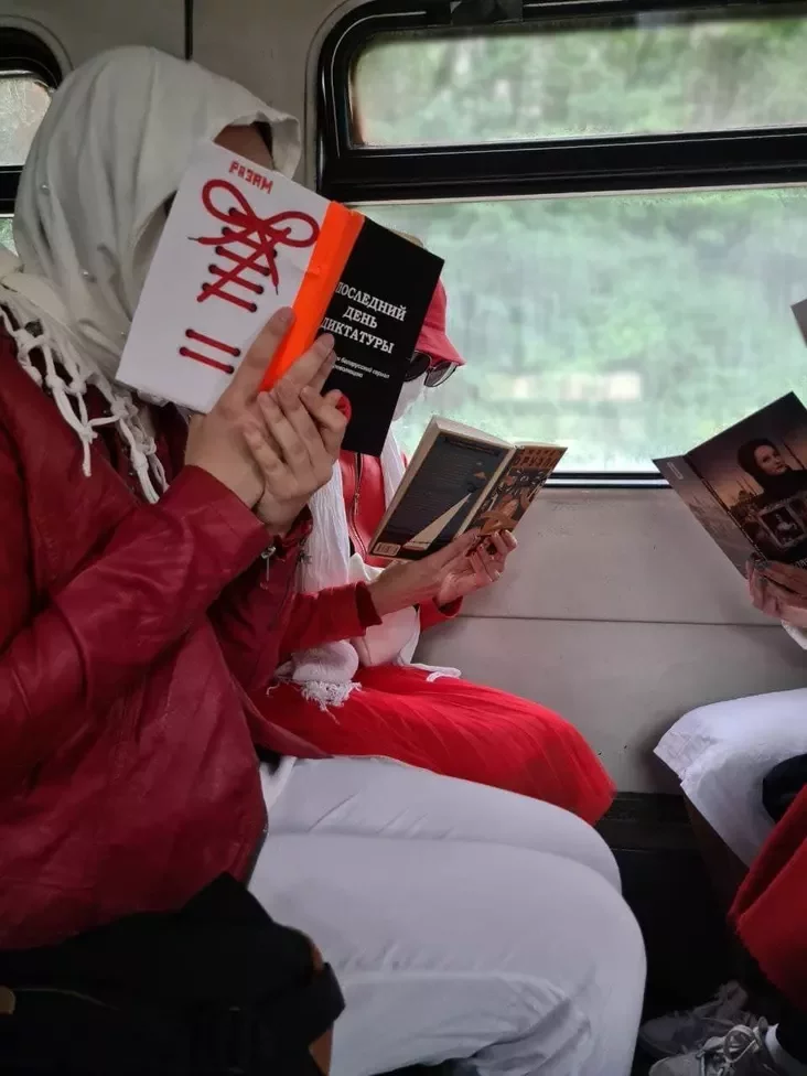 Сёння жанчыны, апранутыя па схеме БЧБ, чыталі літаратуру ў адной з электрычак Гомельскай вобласці.