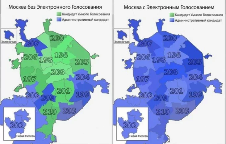 Па выніках «папяровага» галасавання кандыдаты ад ініцыятывы Навальнага «Разумнае галасаванне» перамагалі «Адзіную Расію» ў Маскве з разгромным лікам у многіх раёнах. Па выніках электроннага галасавання ўсе яны раптам прайгралі. Пры гэтым вынікі электроннага галасавання былі абвешчаныя не праз гадзіну, як раней, а нашмат пазней. У выніку ў Маскве не аказалася ніводнай аднамандатнай акругі, дзе атрымалі б перамогу апазіцыйныя кандыдаты.