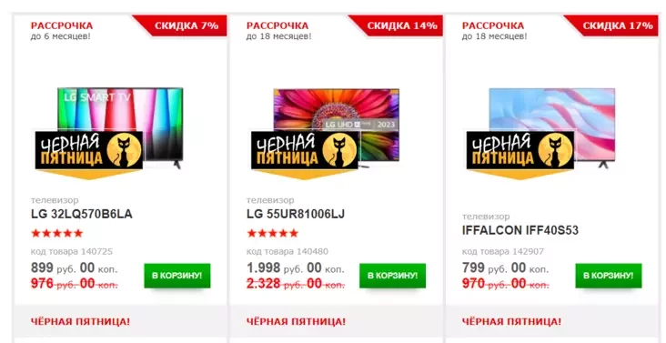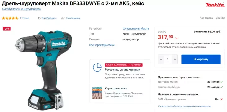 Акрамя звыклых пазіцый тыпу дрыля, які зараз каштуе на 82 рублі танней за свой першапачатковы кошт, у распродажы ўдзельнічаюць і іншыя цікавыя рэчы. Напрыклад, на куплі двухметровай елкі можна зэканоміць 40% — тое, што трэба перад надыходзячымі святамі.