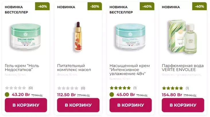 Зніжка ў краме французскай касметыкі і парфумерыі Yves Rocher больш адчувальная — да 70%. Праўда, дзейнічае яна ўсяго на 50 пазіцый тавараў з той колькасці, што прадстаўлена ў краме.