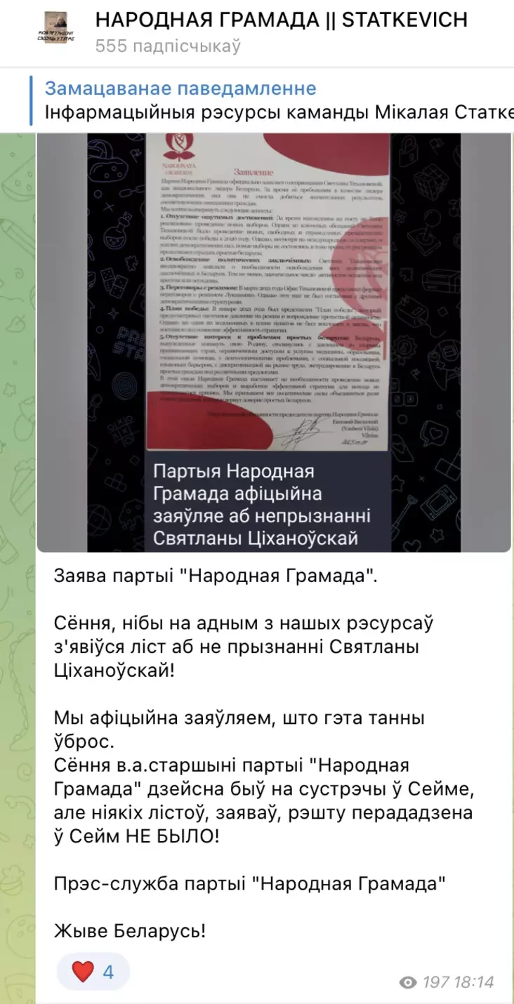 «Сёння в.а.старшыні партыі «Народная Грамада» дзейсна быў на сустрэчы ў Сейме, але ніякіх лістоў, заяваў, рэшту перададзена ў Сейм не было!», — сцвярджае прэс-служба (стылістыка арыгінала захаваная).