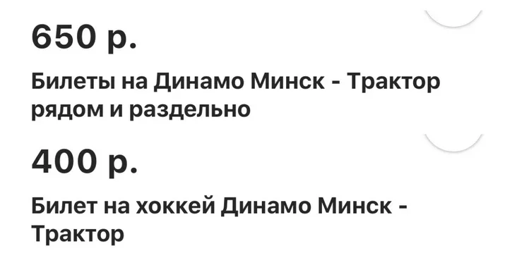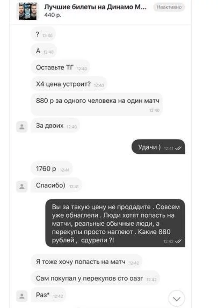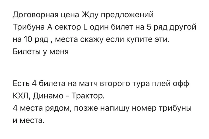 «Пачатковы кошт 220 р. (найлепшыя месцы на арэне). За адзін матч на аднаго чалавека. Мая цана X2 — 440 р. Магчыма пры асабістай сустрэчы. Білеты фізічныя (раздрукаваныя). Прычына продажу: не атрымаецца схадзіць у гэтыя дні».