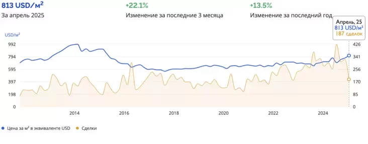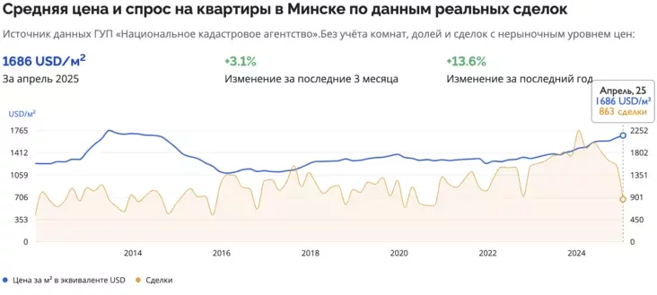Паводле рэальных здзелак, сярэдняя цана квадрата ў сталіцы ў красавіку 2025 года склала 1686 даляраў.