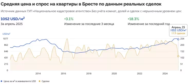 Сярод абласных цэнтраў самая дарагая нерухомасць у Брэсце. Там сярэдні кошт квадрата ў красавіку 2025 года склаў 1052 даляры. Год таму метр у Брэсце каштаваў 889 даляраў. Гэта плюс 18,3% за год.