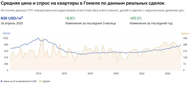 Па выніках красавіка 2025 года метр у Гомелі каштаваў 835 даляраў. Год таму было 695 даляраў. Рост склаў +20,1%.