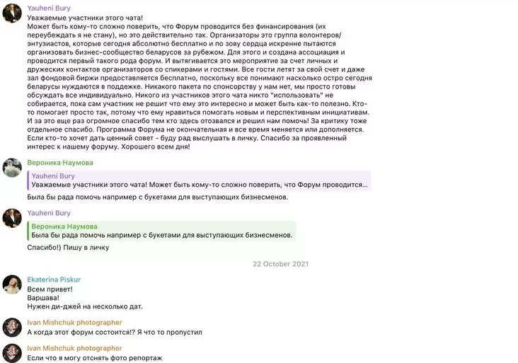 Другое паведамленне, якое ён напісаў 22 кастрычніка 2021, адразу цэліць, куды трэба. Мішчук прапанаваў Яўгену Бураму, кіраўніку Асацыяцыі беларускага бізнэсу за мяжой, свае паслугі рэпартажнага фатографа на бізнэс-форуме ABBA ў Варшаве.