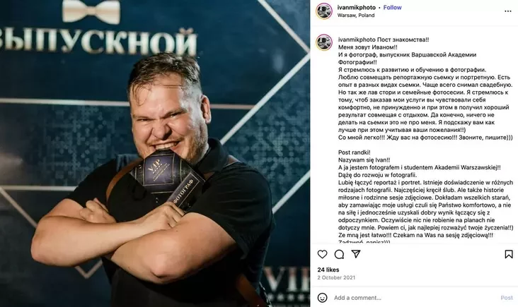 «Часта здымаю на мерапрыемствах рознага роду: івэнты забаўляльнага ці бізнэс-характару. Працую па Варшаве і на выезд па Польшчы. У асноўным працую з рускамоўнымі», — адказаў нам Мішчук.