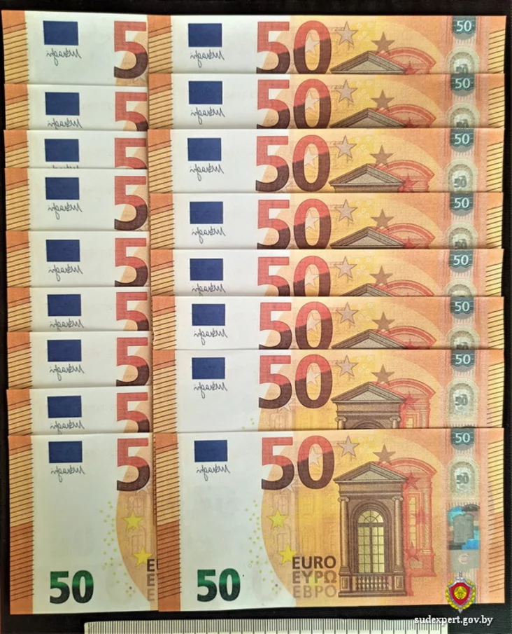 Паводле высноў эксперта, амаль усе купюры наміналам 50 еўра, за выключэннем адной, выраблены не прадпрыемствам, якое ажыццяўляе вытворчасць прадукцыі дадзенага віду, і выкананы спосабам плоскага афсетнага друку.