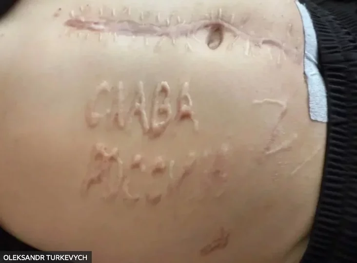 Відавочна, надпіс зрабілі падчас аперацыі, якую расіяне праводзілі ўкраінскаму палоннаму з-за ранення.