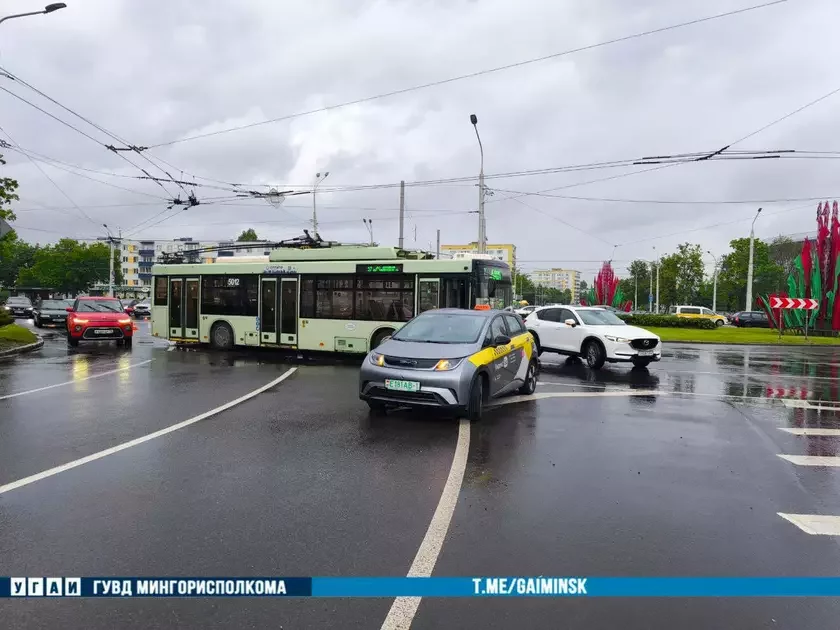 Напярэдадні вечарам на кругавой развязцы плошчы Ванеева адбылося сутыкненне белага легкавога аўтамабіля BYD і тралейбуса, паведамляе ДАІ