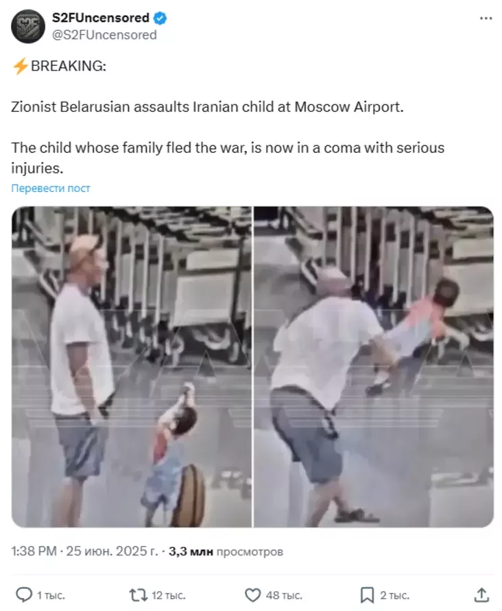 «Беларускі сіяніст нападае на іранскае дзіця ў аэрапорце Масквы. Дзіця, чыя сям’я ўцякла ад вайны, цяпер у коме з цяжкімі траўмамі», — так падпісаў палітычны акаўнт S2FUncensored два скрыншоты з нападам на хлопчыка ў «Шарамеццеве». Пад твітам без малога 50 тысяч лайкаў, 12 тысяч рэтвітаў і ўжо больш за 3 мільёны праглядаў.