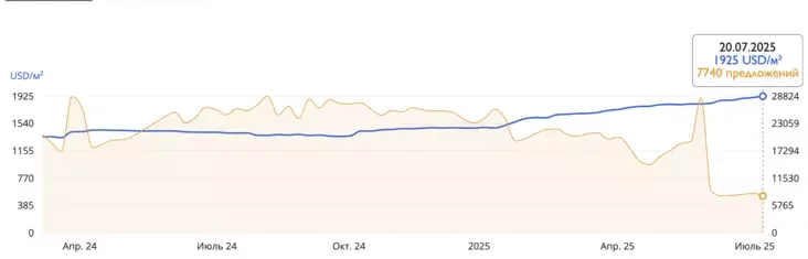 Адметна, што ў апошнія месяцы рост толькі паскорыўся. Калі 18 мая кошт метра па прапановах складаў $1810, то ўсяго праз два месяцы ён дасягнуў $1925. Гэта плюс 6,3% за два месяцы.