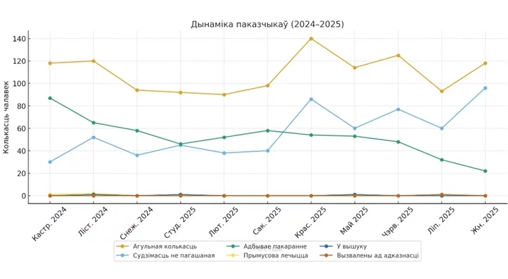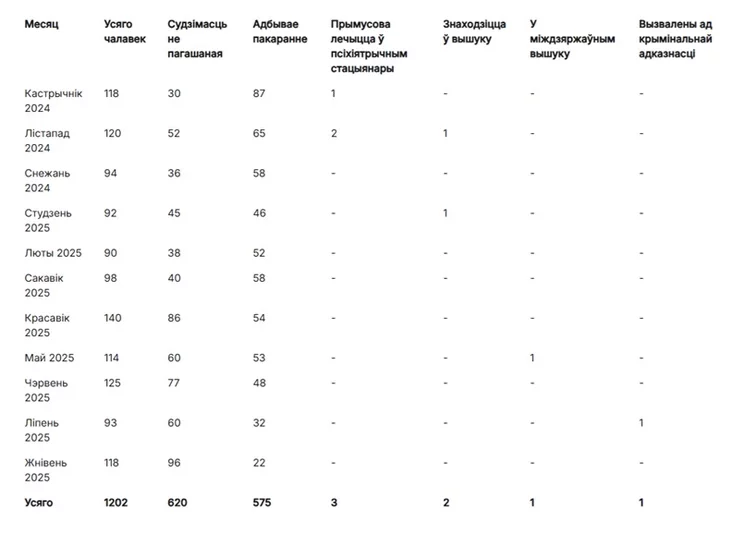 Аднак і без іх відаць, што ў канцы мінулага і пачатку гэтага года жорсткія прысуды атрымлівалі штомесяц 45-65 чалавек. У ліпені 2025 года лік скараціўся да 32 чалавек, у жніўні 2025 — ужо 22 чалавекі.