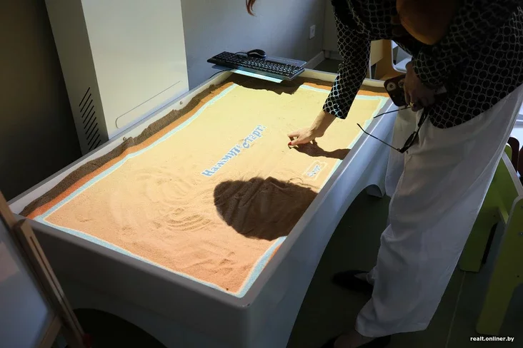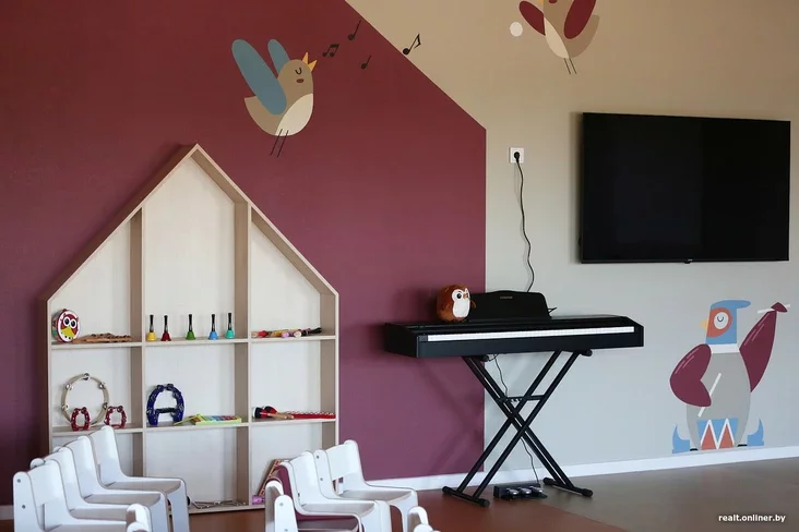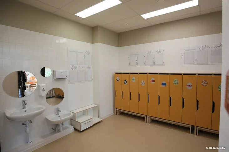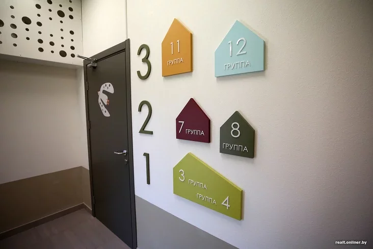 Унутры, як і чакалася, — мілата зашкальвае: маленькія шафкі, столікі, крэслы. Дызайнеры сышлі ад крыклівых чырвоных і жоўтых колераў. «Мы выкарыстоўваем яркія, але прыемныя колеры. Яркія — пераважна ў агульных прасторах, а спакойныя — у кабінетах псіхолага, лагапеда, у групах. Яны не так узбуджаюць дзіця, дазваляюць засяродзіцца на занятках або спакойна заснуць», — тлумачыць Андрэй Пашаў, галоўны архітэктар «А-100 Девелопмент».