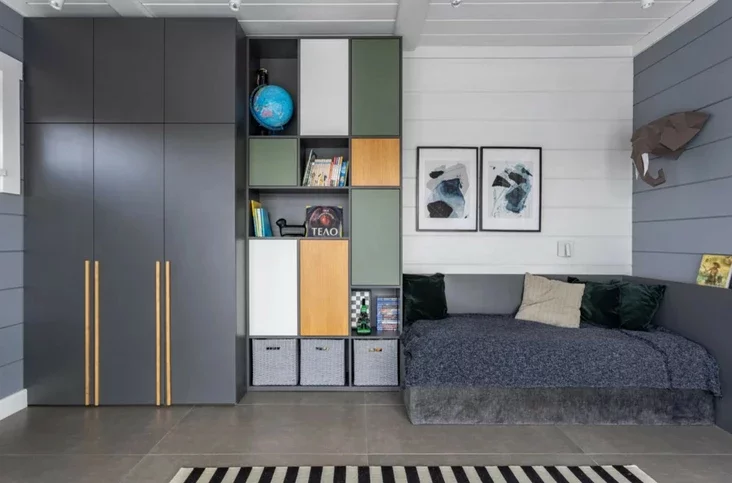 Унутры — мінімалізм са скандынаўскімі акцэнтамі: белыя і шэрыя сцены, лакальныя каляровыя ўстаўкі накшталт кухні травянога адцення або сіняй сцяны ў спальні. Разыначку дадаюць панарамныя вокны — яны выраблены з дрэва.