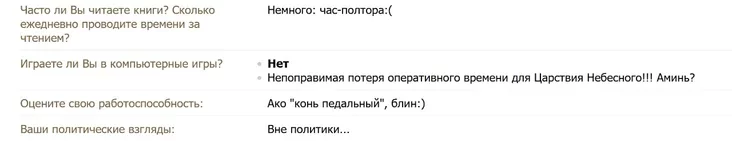 А 52‑гадовы случчак на пытанне «Аб чым шкадуеце больш за ўсё?» піша: «Што не стаў мільянерам. Госпад хутка гэта выправіць». Таксама прызнаецца, што «п'е рэдка, але метка».