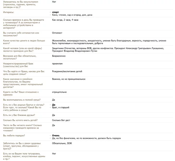 У адрозненне ад звычайных сайтаў ці дадаткаў для знаёмстваў тут мужчыны настроены даволі рашуча і як правіла не знікаюць пасля першага панылага «Прывет». Нехта адразу высылае падрабязнае рэзюмэ з расповедам пра сябе і свае дасягненні пачынаючы з малодшай групы дзіцячага садка. А напрыканцы дадае: «Пры ўзаемнай сімпатыі буду рады стварыць шчаслівы саюз і прайсці з вамі дарогамі кахання і шчасця».