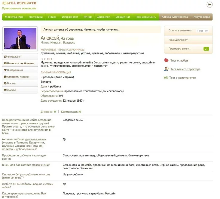 Нават на праваслаўным сайце знаёмстваў Аляксей Талай хваліць Лукашэнку і Пуціна. Праўда, каб зацікавіць там паралімпійца, давялося пабыць 20‑гадовай цнатліўкай.
