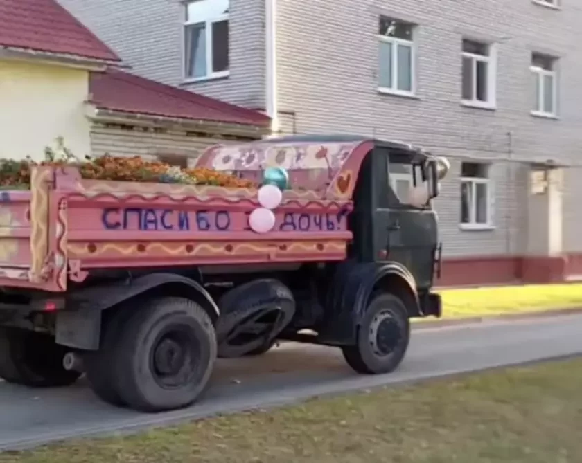 Мужчына пафарбаваў кузаў у ружовы колер, нагрузіў яго кветкамі, павесіў шарыкі і плакат «Дзякуй за дачку» і прыехаў да радзільнага дома.