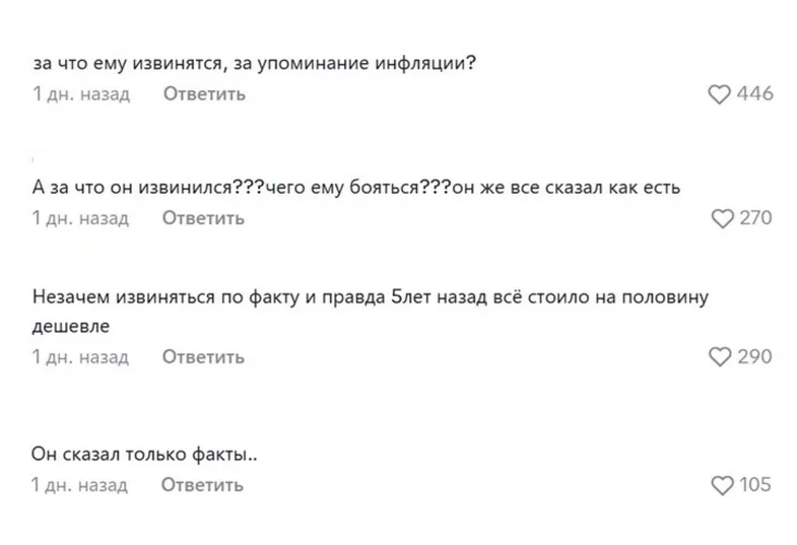 «За што яму выбачацца, за згадку інфляцыі?», «А за што ён выбачыўся? Чаго яму баяцца? Ён жа ўсё сказаў як ёсць», «Непатрэбна выбачацца па факце. І праўда, пяць гадоў назад усё каштавала напалову меней», «Ён сказаў толькі факты».