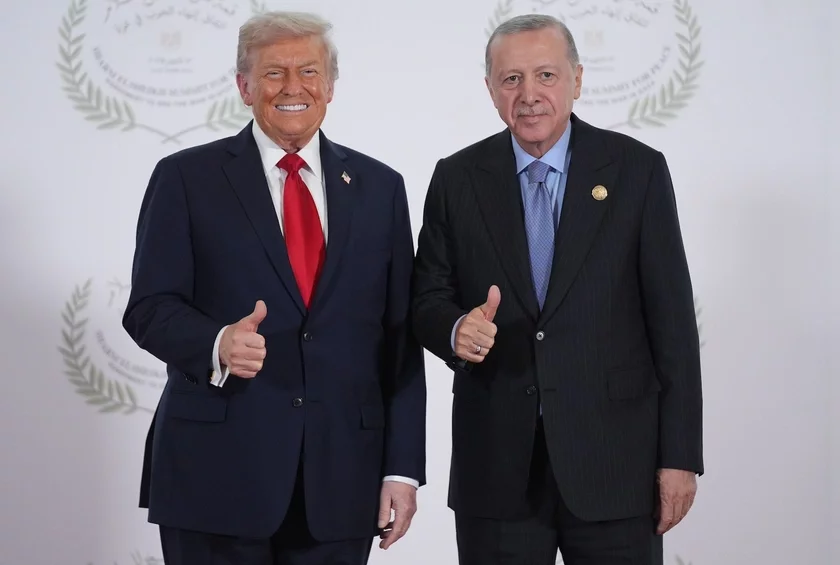 Дональд Трамп і Рэджэп Таіп Эрдаган на саміце ў Шарм аль-Шэйху 13 кастрычніка 2025 года. Фота: Evan Vucci — Pool/Getty Images