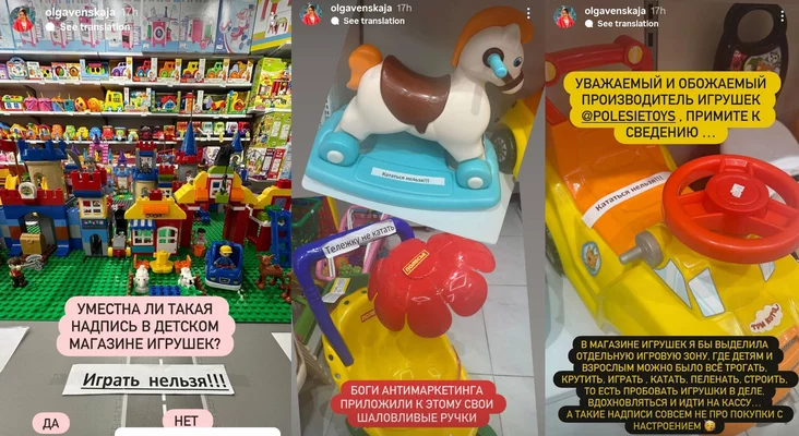 Вольга Венская задаецца пытаннем, ці дарэчныя такія надпісы ў дзіцячай краме цацак. Яна лічыць, што прыдумаць такое маглі толькі богі антымаркетынгу.