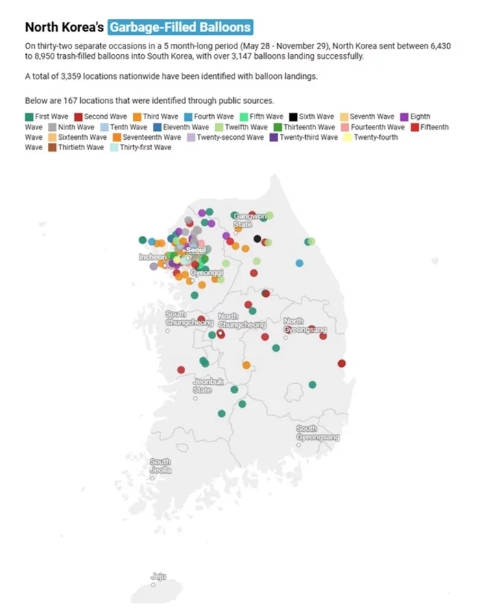 У 2024‑м ва ўсёй Паўднёвай Карэі, ад прыгранічных раёнаў да сталіцы Сеула, былі зафіксаваны сотні велізарных паветраных шароў, якія неслі ў сабе не ідэалагічныя паведамленні, а бытавое смецце.