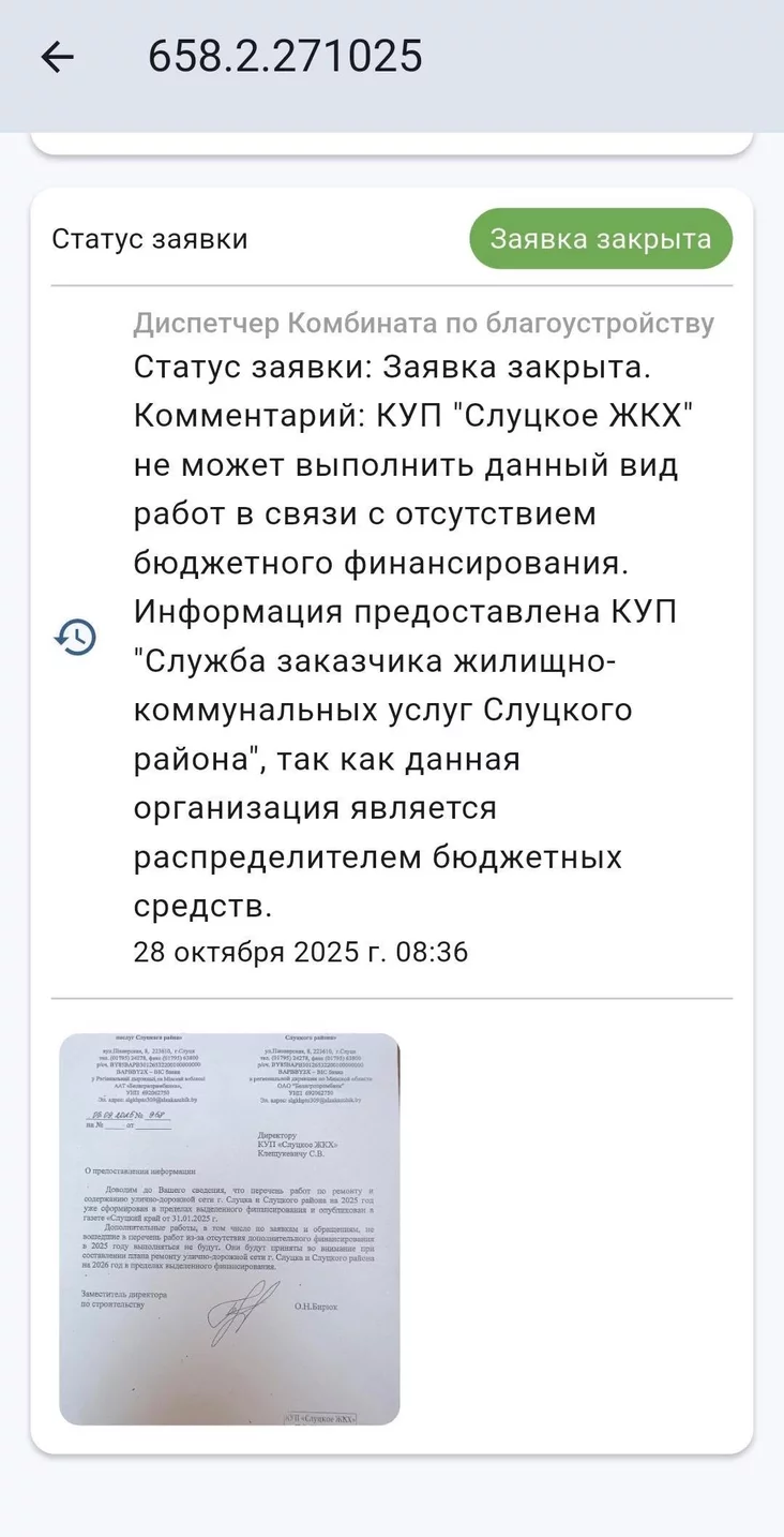 «Даводзім да Вашага ведама, што пералік работ па рамонце і ўтрыманні вулічна-дарожнай сеткі г. Слуцка і Слуцкага раёна на 2025 год ужо сфарміраваны ў межах выдзеленага фінансавання і апублікаваны ў газеце «Слуцкі край» ад 31.01.2025 г.