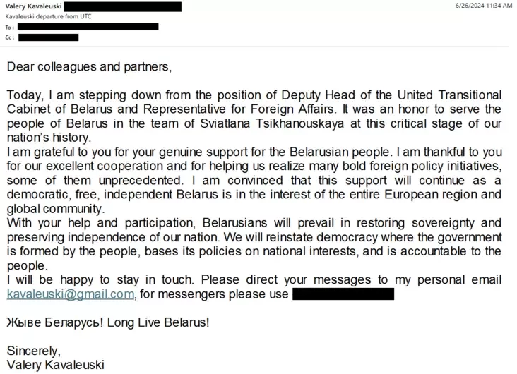 Прыведзеная ў артыкуле выдання The Grayzone перапіска адбывалася 1‑3 чэрвеня 2024 года. 26 чэрвеня 2024 года Валер Кавалеўскі абвясціў пра сваю адстаўку. Тэхнічна доступ да пошты захоўваўся за ім на тэрмін, неабходны для перадачы спраў».