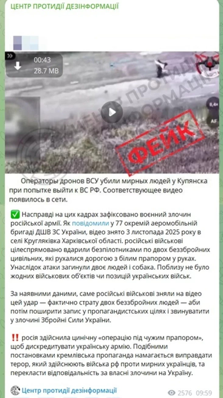 Цэнтр супрацьдзеяння дэзінфармацыі заявіў, што Расія здзейсніла цынічную аперацыю пад чужым сцягам і назвала паведамленне расіян фэйкам.