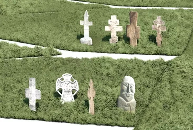 Адкуль іх збіраюцца ўзяць, не паведамляецца, аднак на візуалізацыях можна заўважыць і цюркскую каменную бабу VI—VIII стагоддзяў з выявай вусатага ваяра з чараю ў руцэ, якая ніяк не звязаная з хрысціянствам — такіх баб ставілі ў Цюркскім каганаце.