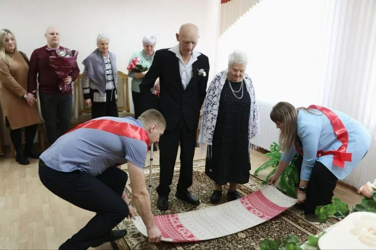 Наля Харытонаўна на цырымонію прыйшла святочна адзетай. Белы шалік замест вэлюму, элегантная фрызура і макіяж, букет кветак. Муж з жонкай ступілі на ручнік і абмяняліся пярсцёнкамі.