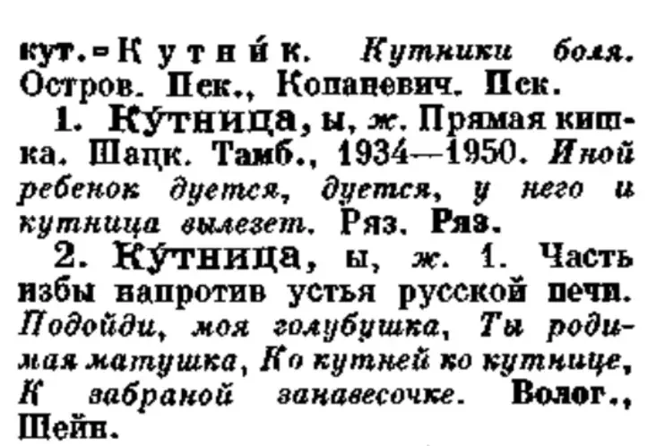«Słoŭnik ukrainskaj movy», składzieny ŭ pačatku XX stahodździa Barysam Hrynčankam, fiksuje słova kutnícia z tym ža značeńniem ‘pramaja kiška' ŭ Radamyslskim paviecie Kijeŭskaj hubierni, jaki, varta adznačyć, miežavaŭ ź Minskaj hubierniaj. Kudy mienš vierahodna, što ź biełaruskim upłyvam heta słova kútnica, układzienaje ŭ «Słoŭnik ruskich narodnych havorak», źjaviłasia ŭ ruskich havorkach Šackaha pavieta Tamboŭskaj hubierni i Razanskim paviecie Razanskaj hubierni. Darečy rodnasnaje polskaje kątnica abaznačaje zusim inšuju kišku — ślapuju.